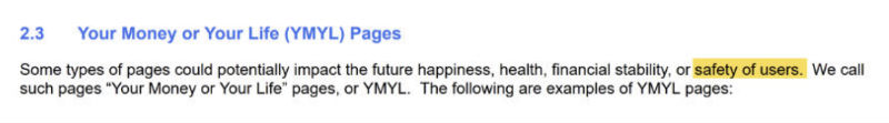 ما معتقدیم گوگل تغییرات قابل توجهی را در الگوریتم هایش اعمال کرده است که بتواند بصورت الگوریتمی اعتماد را شناسایی کند، و این کار با آپدیتی (Medic) در 1 آگوست شروع کرد. درست قبل از این آپدیت، گوگل نسخه جدیدی از دستورالعمل ها را برای رتبه دهندگان به کیفیت منتشر کرد. درحالیکه چیزهای زیادی در این نسخه تغییر کرده است، بنظر ما مهم ترین آن اضافه شدن کلمه “ایمن” بوده است. قبل از آپدیت 1 آگوست 2018 قسمت های هایلایت شده در زیر به QRG اضافه شدند.